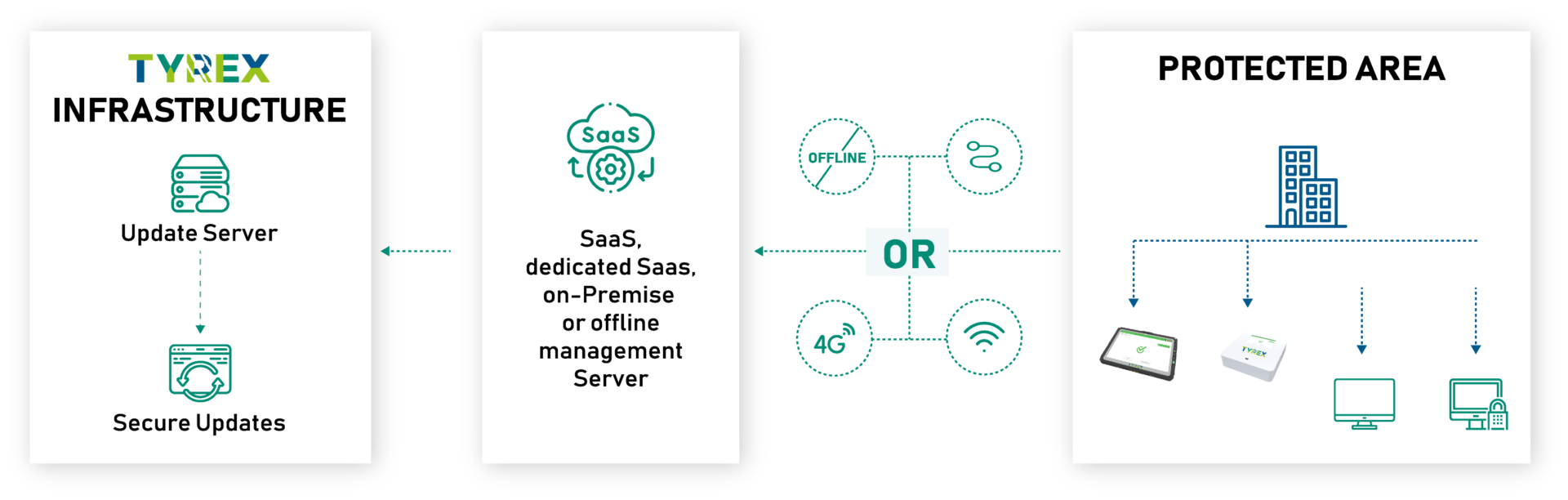 The TOTEM can be monitored via a management server which allows you to configure your whole TYREX fleet. With our optional Workstation Protect agent, you can also choose to prevent unauthenticated USB devices from accessing your information systems.