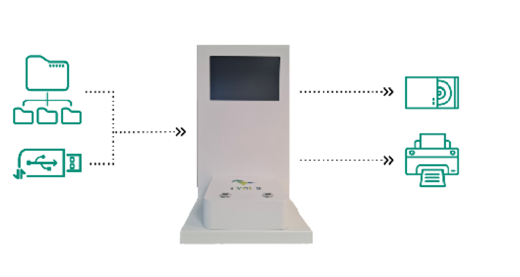 The TYREX delivery station consists of a CONSOLE decontamination station with 2 USB ports, a printer and a CD burner. It performs a complete scan of the data presented as input, using several threat detection solutions, enabling data to be transferred in a highly secure way, so that it can be delivered under the best possible security conditions.